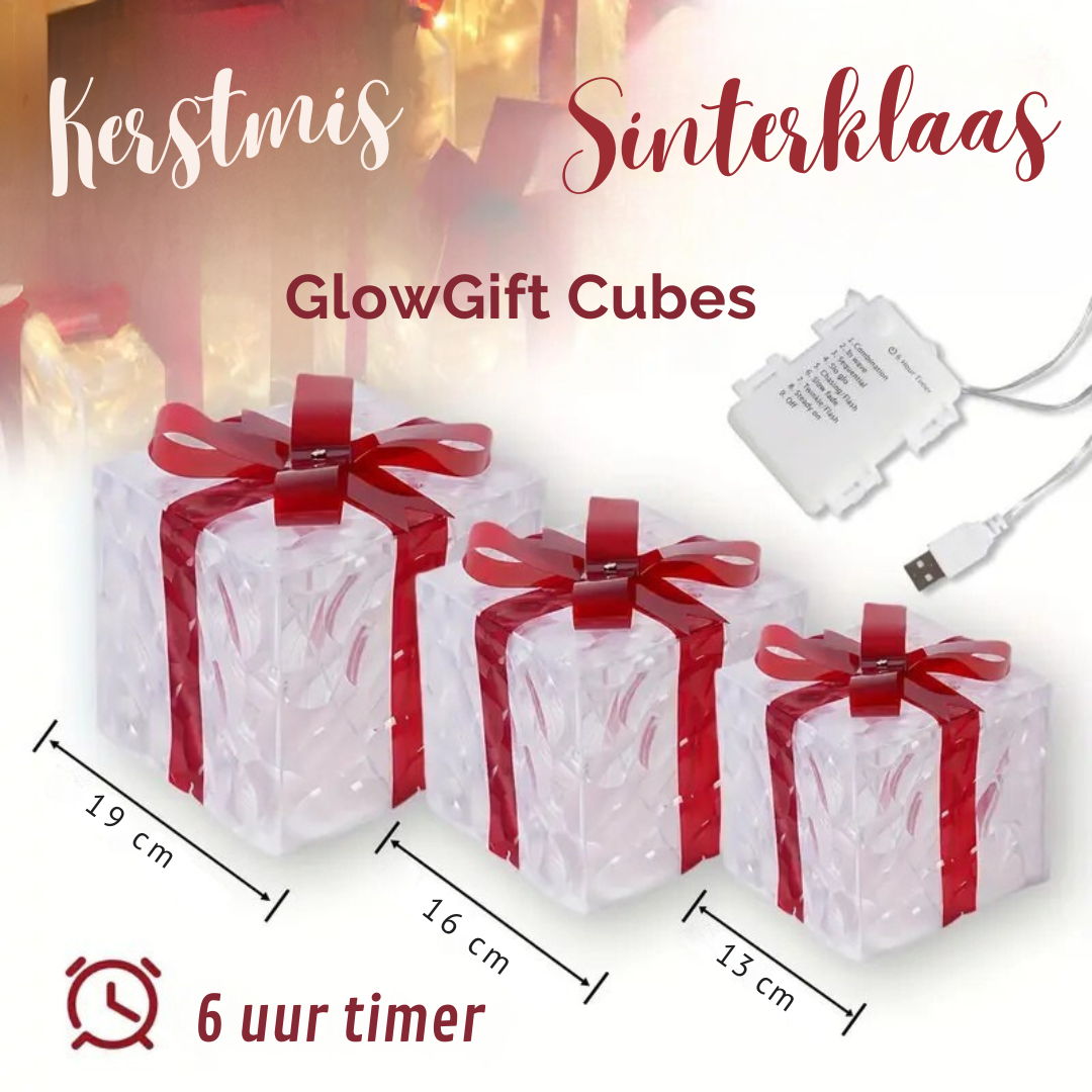 De dozen zijn transparant en voorzien van subtiele linten, waardoor de ingebouwde warmgele LED-lampjes prachtig door de kubus heen stralen. Je hebt keuze uit 8 verschillende lichtstanden: van zacht knipperend tot constant warm licht. Dankzij de timerfunctie hoef je nooit meer zelf aan of uit te zetten – de GlowGift Cubes regelen het voor jou.