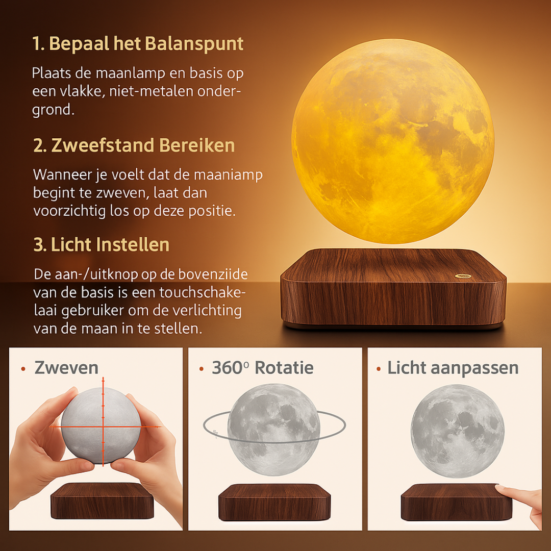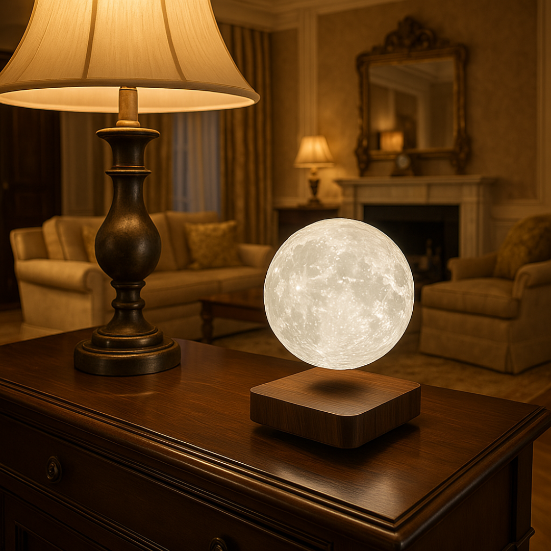 De maan zweeft echt, volledig vrij in de lucht dankzij magnetische levitatie.