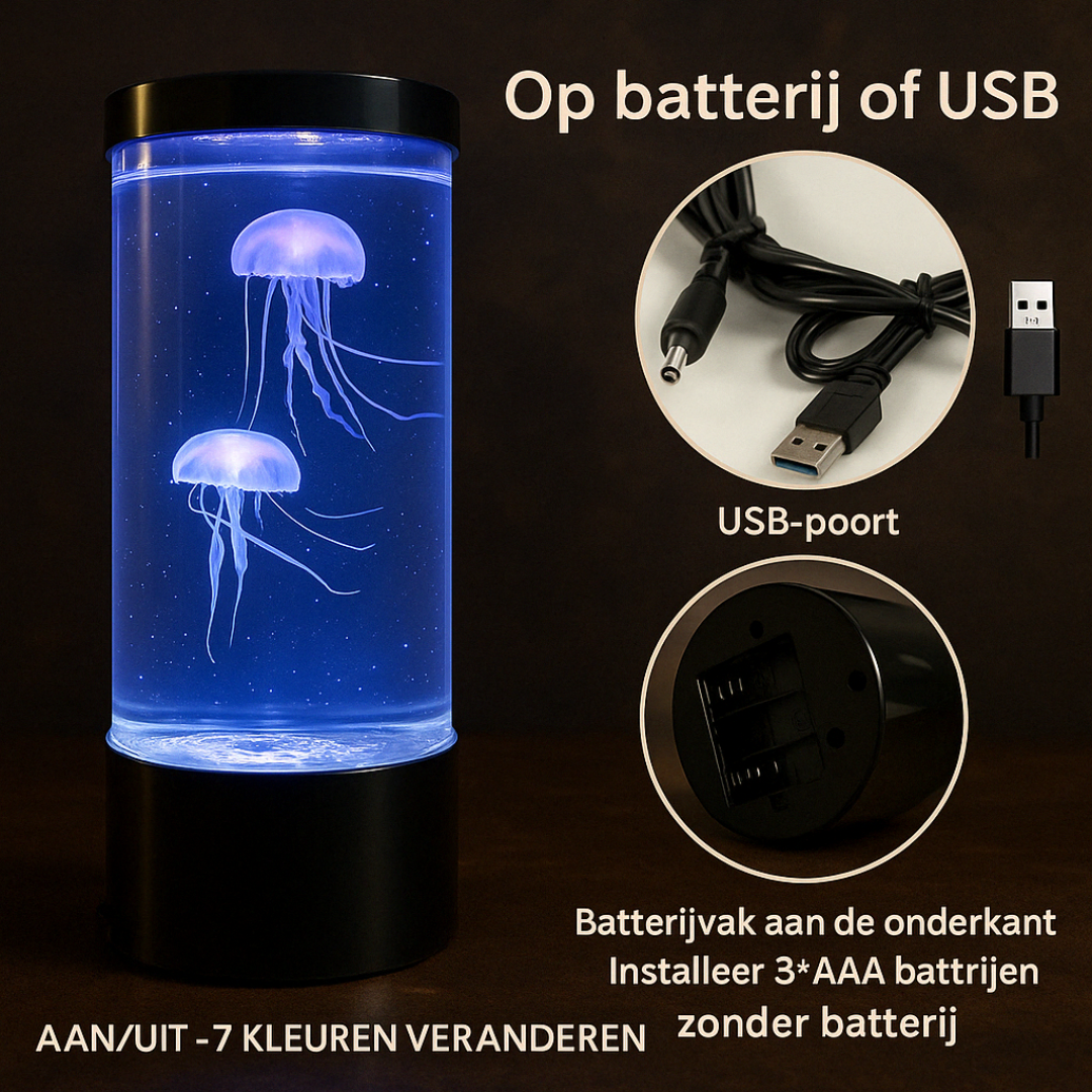 De lamp bevat twee realistische kwallen (“jellyfish”) die in water zwemmen, met een fluisterstil mechanisme dat zachtjes de bewegingen aanstuurt. De lamp bevat LED-verlichting met 7 kleurmodi die afwisselend oplichten, wat zorgt voor een rustgevende sfeer. De lamp werkt op USB of 3x AAA-batterijen.