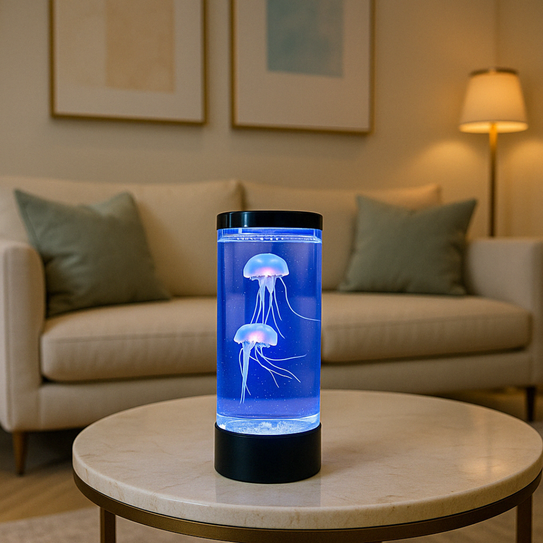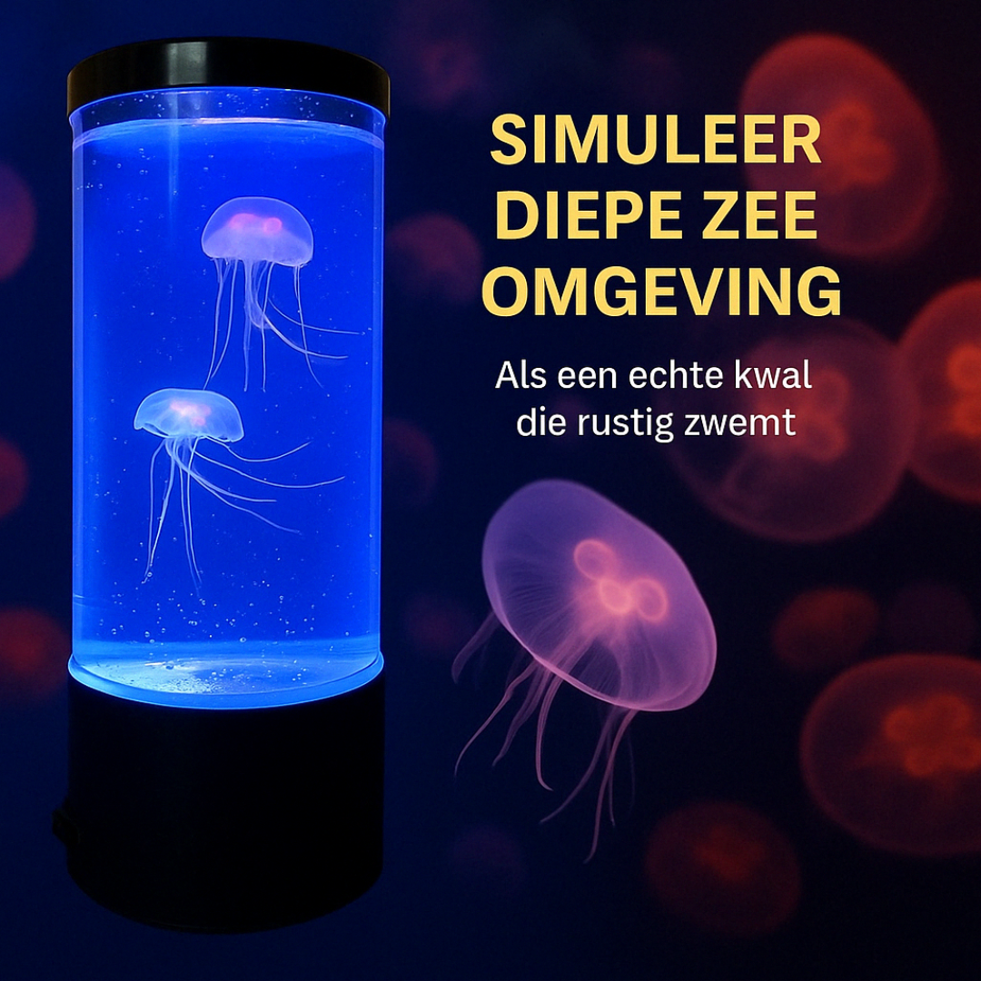 Stap uit de drukte van alledag en duik in een wereld van rust en betovering met JellyDream, het unieke sfeerlampje dat de magie van de oceaan in huis haalt. In deze elegante LED-lamp zwemmen twee realistische jellyfish langzaam en sierlijk rond, terwijl het water zachtjes oplicht in een ritme van 7 wisselende kleuren. Het hypnotiserende schouwspel van beweging en licht zorgt direct voor ontspanning – perfect voor op het nachtkastje, je bureau, of als sfeervolle decoratie in elke ruimte.
