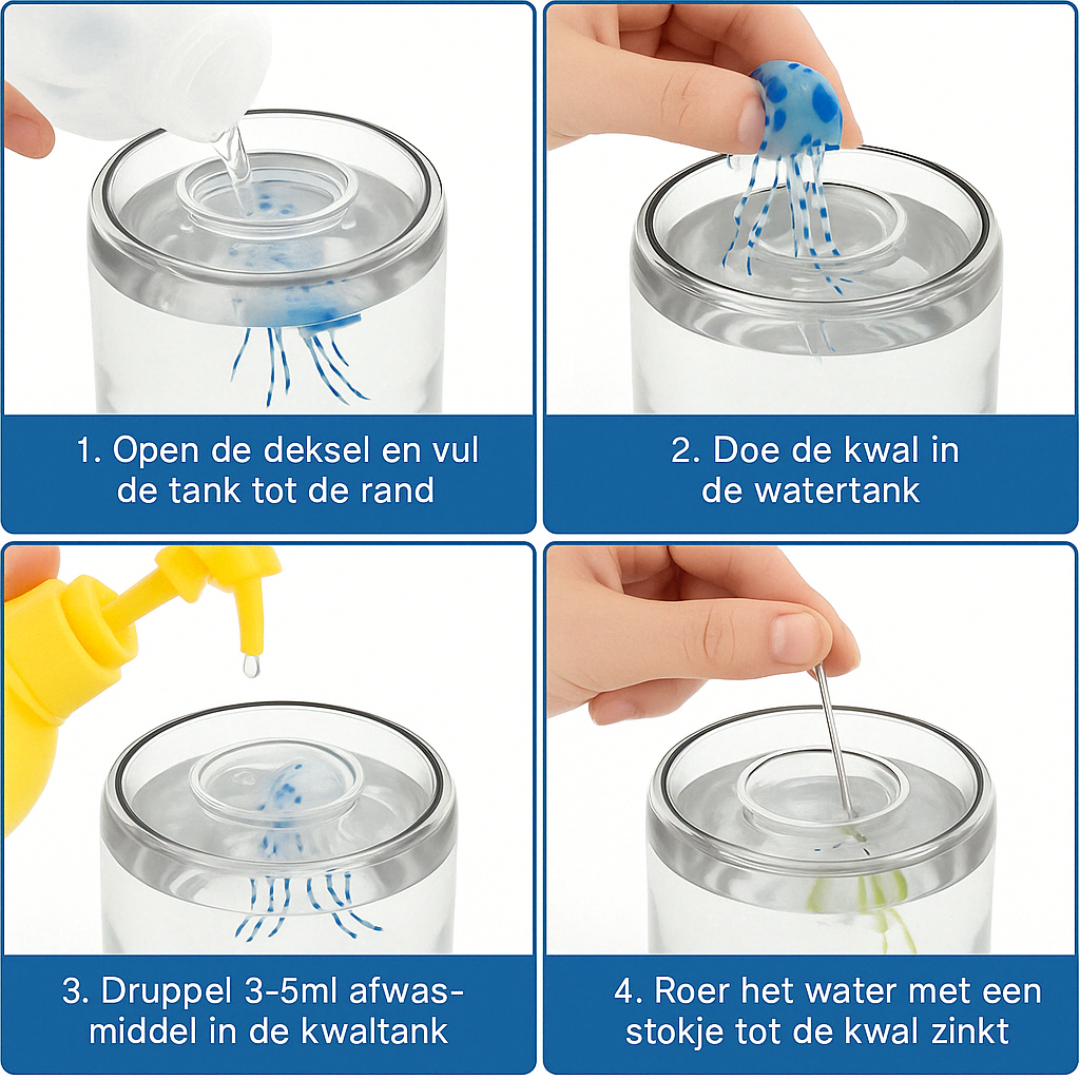 Laat de twee jellyfish in het water glijden. Tik eventueel zachtjes tegen de zijkant zodat ze niet blijven drijven.