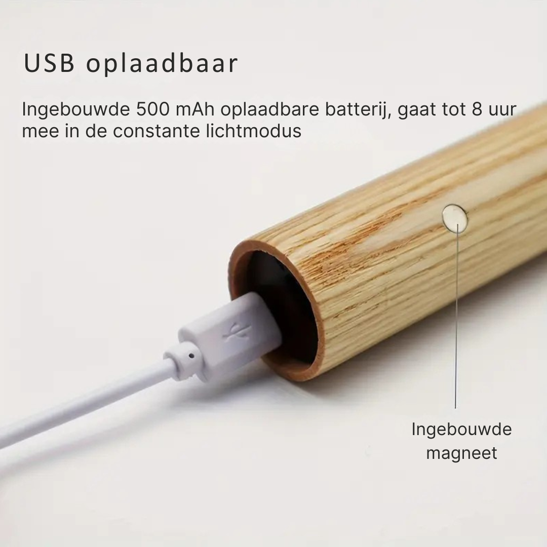 De LumiWood wordt geleverd met een USB-kabel. Daarmee laad je de ingebouwde 500 mAh lithiumbatterij eenvoudig op via een adapter, powerbank of laptop.